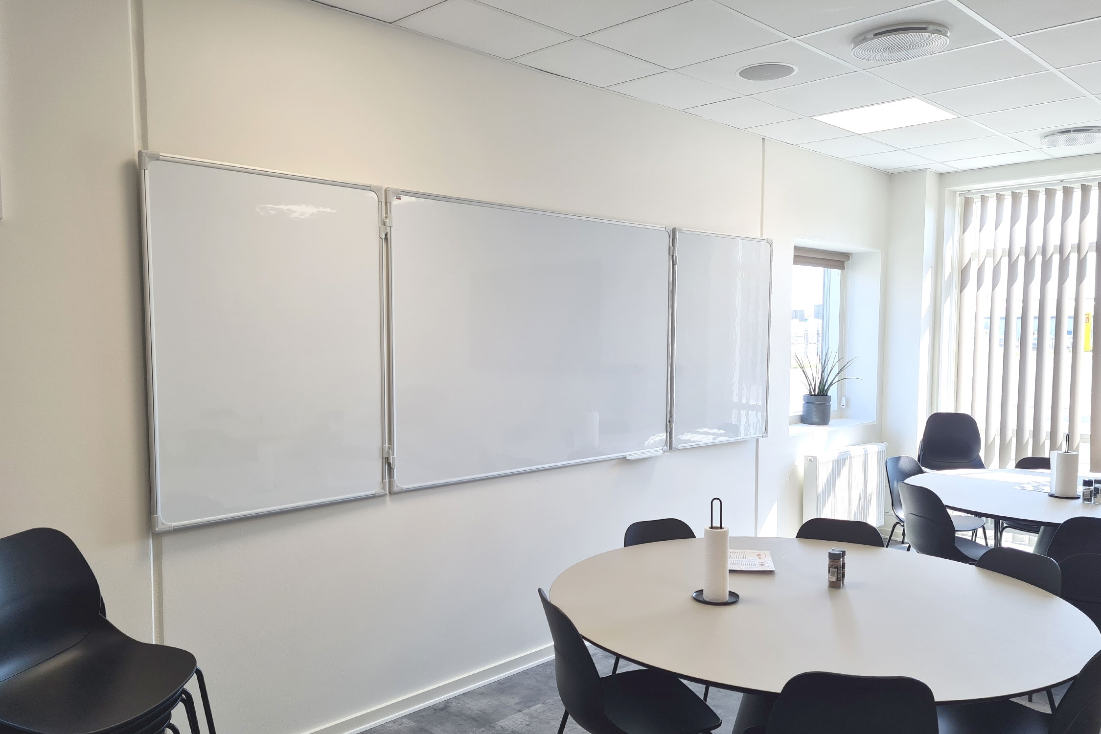 Whiteboarden består av en central tavla samt två gångjärnsförsedda dörrar som kan fällas ut. Dörrarna är dubbelsidiga whiteboards, vilket innebär att du vid öppning av dörrarna fördubblar tavlans totala bredd och får tillgång till flera separata skrivytor. Totalt får du flera oberoende whiteboard-ytor som gör det enkelt att arbeta parallellt med till exempel planering, presentationer eller grupparbete.