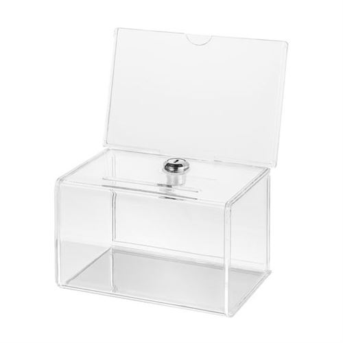 Denna stilrena förslagslådan passar in i samtliga arbetsmiljön och fungerar som ett samlingspunkt för åsikter, röstningar eller ståndpunkter. Infotoppen har plats till ett papper i storleken A6 i bredformat, som ger möjligheten för placering av namn, budskaper, och loggor. Kistan är också låsbar, då den har ett inbyggt lås, för att förhindra stöld. 2 st nycklar medföljer.