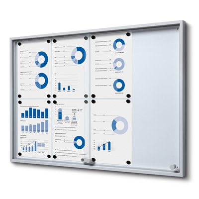 Skyltskåp tillverkat i metall och aluminium, med magnetiskt skrivbart 8xA4 whiteboard-bakstycke med ett inre djup på 23 mm, smal grå profilram, skjutdörrar av 4 mm säkerhetsglas med inbyggd lås. 2 nycklar medföljer. Kan användas med whiteboardpennor och magneter.
