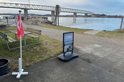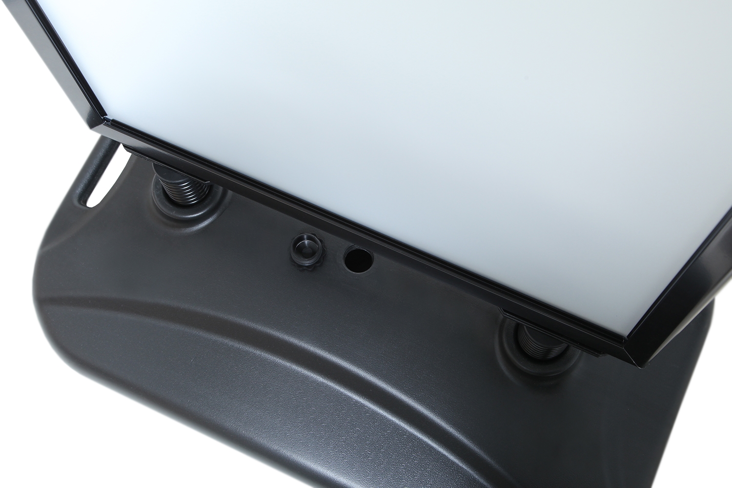 Även om skylten är tung och stabil är den vädigt enkel att flytta ut och in, tack vare de 2 hjulen på foten. Skylten kan helt enkelt lutas till den ena sidan och rullas.