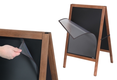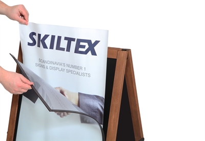 Denna fantastiska skylt kan både användas som en traditionell gatupratare till affischer i A2 storlek, eller som griffeltavla som man kan skriva på med griffelpennor.