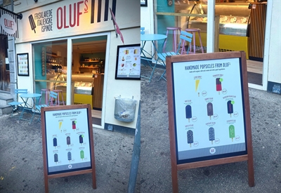 Denna fantastiska skylt kan både användas som en traditionell gatupratare till affischer i 50x70 cm storlek, eller som griffeltavla som man kan skriva på med griffelpennor.