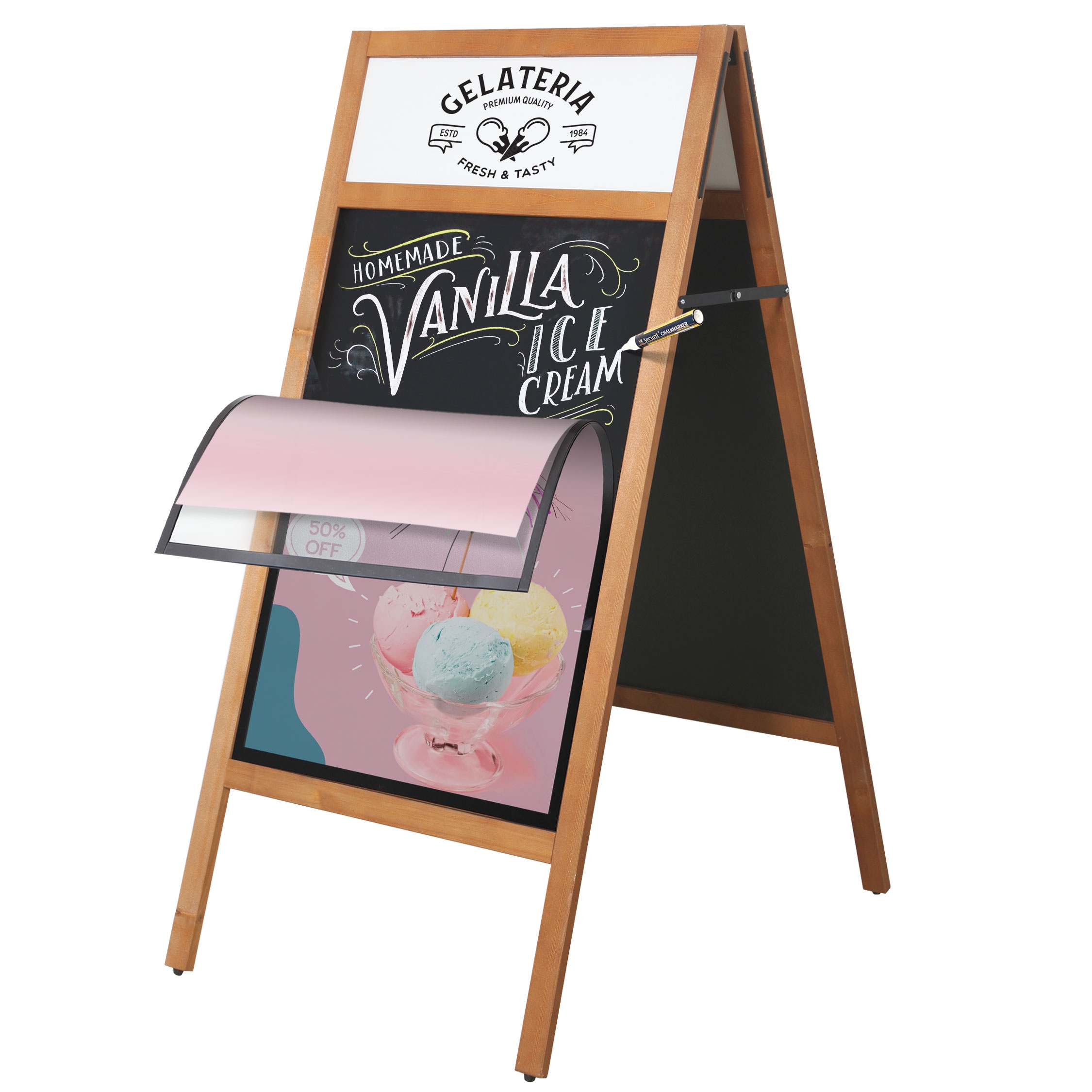 Denna fantastiska skylt kan både användas som en traditionell gatupratare till affischer i A1 storlek, eller som griffeltavla som man kan skriva på med griffelpennor.