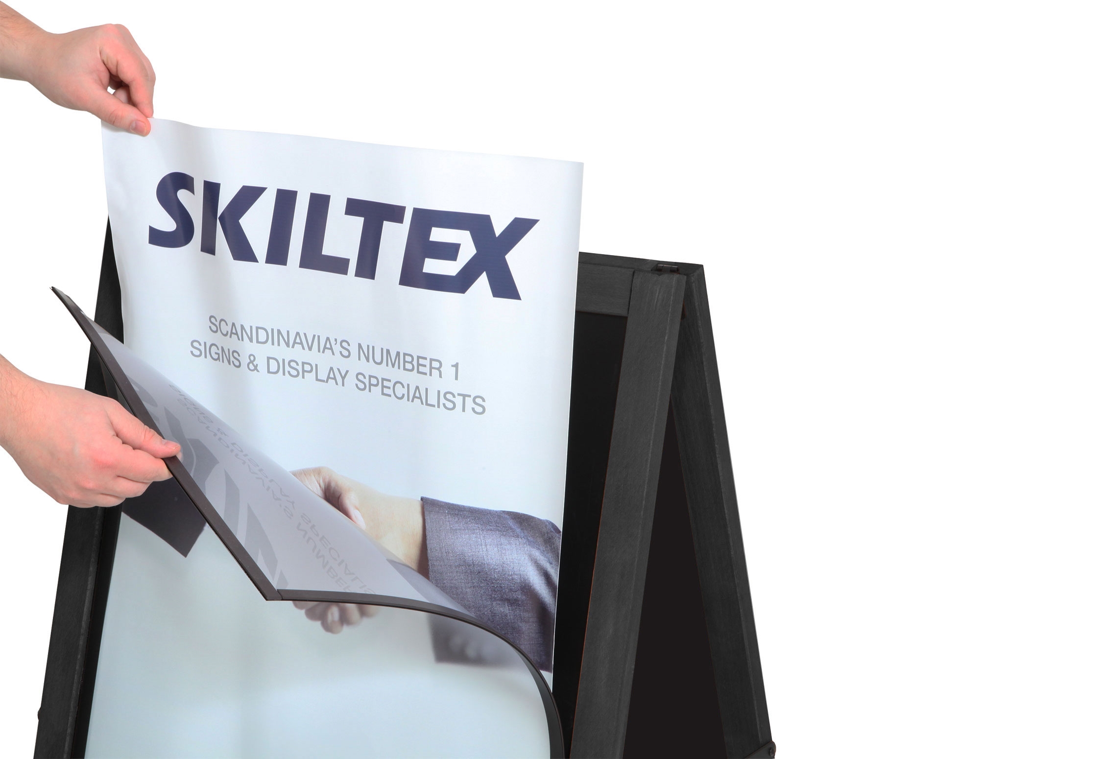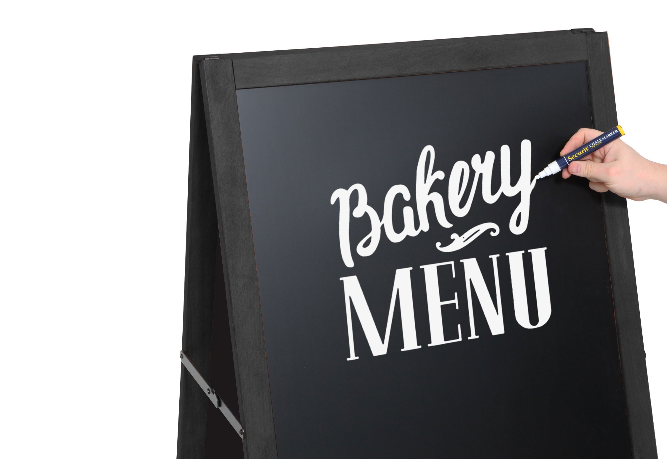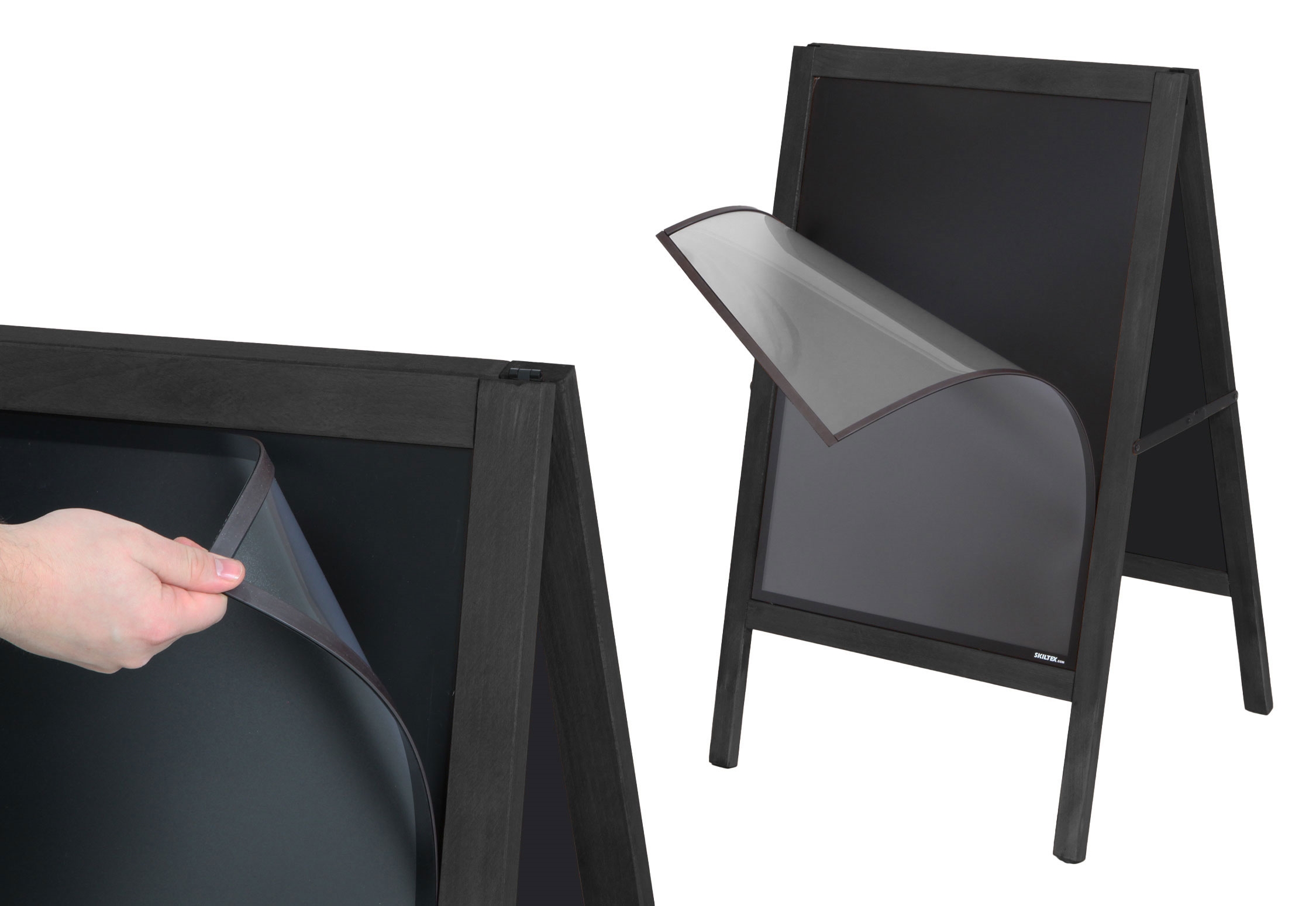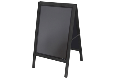 Denna fantastiska skylt kan både användas som en traditionell gatupratare till affischer i A2 storlek, eller som griffeltavla som man kan skriva på med griffelpennor.
